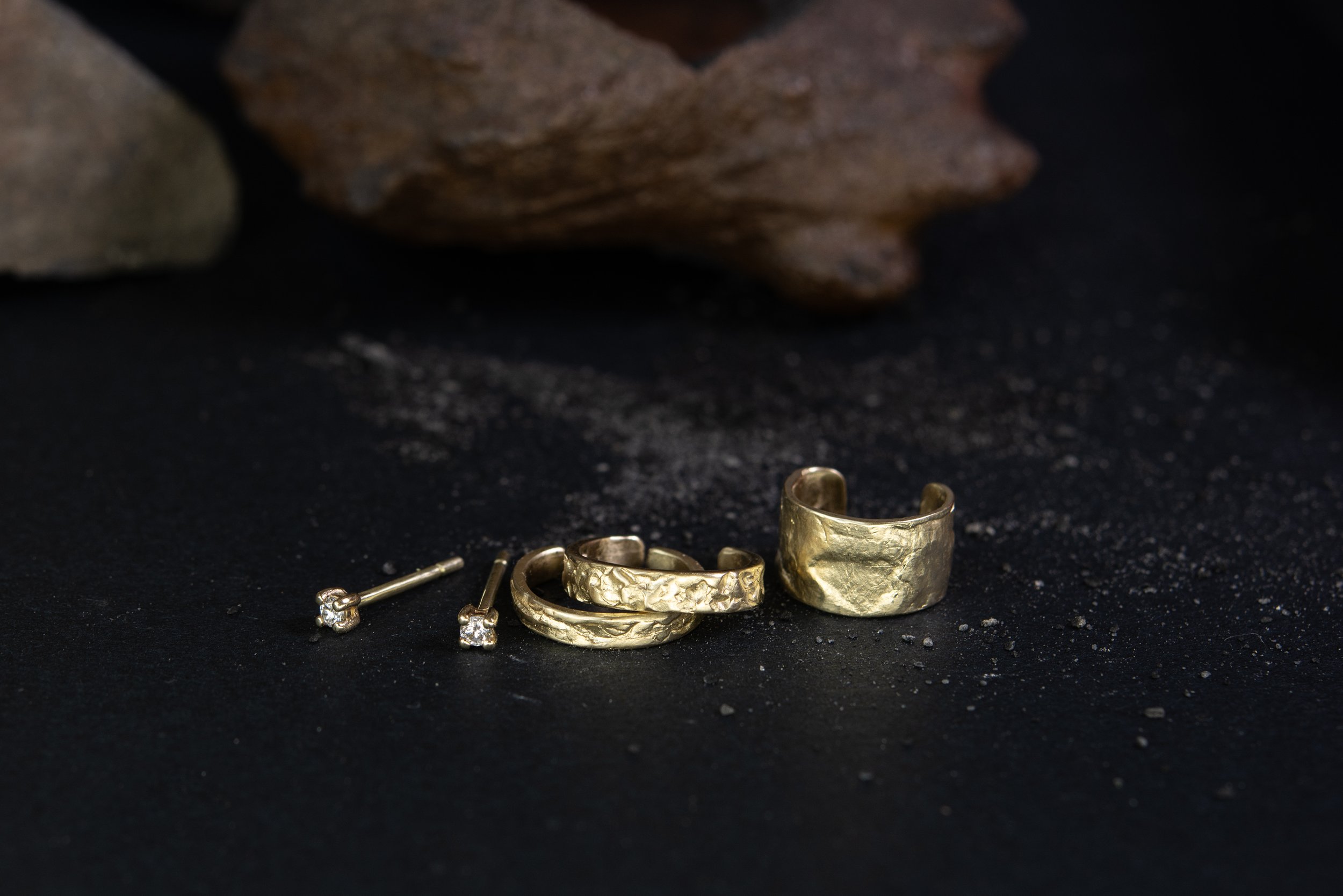 Discover handcrafted solid gold earrings, rings and necklaces etched with stories of the earth.