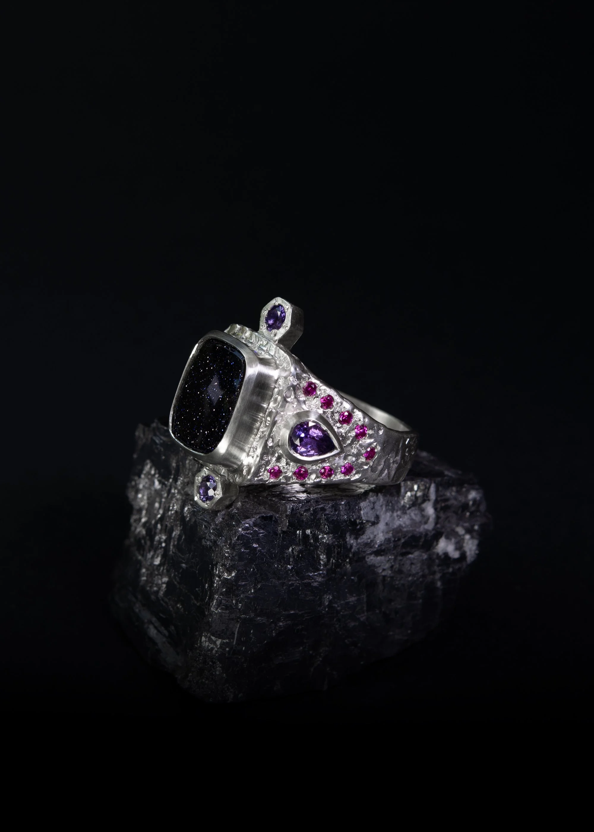 This bespoke silver ring memorialises our client's beloved departed dog. Her ashes are lovingly entombed beneath a blue goldstone that sparkles with tiny stars — evoking a portal to the infinite, a cosmic gateway to the beyond. Surrounding this celestial centrepiece are rich purple sapphires and vibrant rubies, forming a radiant constellation of colour and emotion. Designed to command presence on the hand, this piece was crafted to mirror the bold, loyal and queenly spirit of its muse — blazing brightly like a supernova in the heavens.